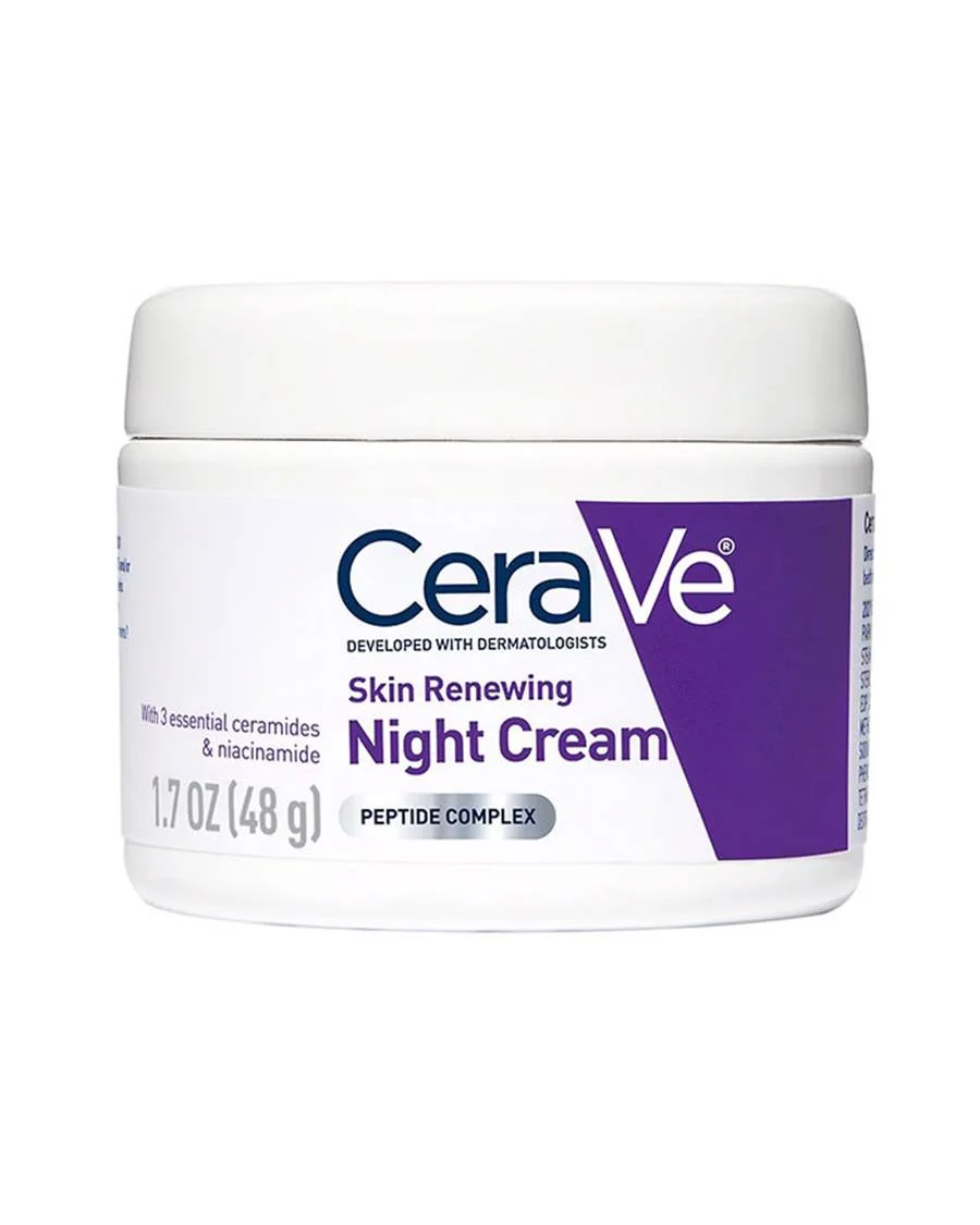Nighttime is the skin’s chance to help renew itself, and a properly formulated night cream provides hydrating and rejuvenating benefits. We recommend looking for formulas designed with hyaluronic acid, niacinamide and ceramides to hydrate, calm and restore the skin barrier, like our CeraVe Skin Renewing Night Cream, which also features peptides to help improve the appearance of fatigued skin.